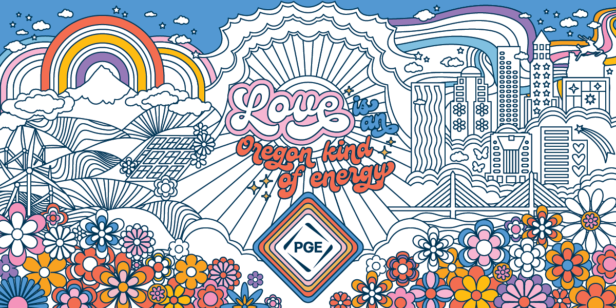 As lead designer at Portland General Electric (PGE), I was responsible for the ideation, concepting and execution of our brand activation at the Portland Pride Festival. This included the event theme, 12’ wide coloring wall mural custom illustration, shirt and tote artwork, 3D LED backlit custom sign artwork, interior decor and overall environmental design, as well as art directing the interior and exterior signage.