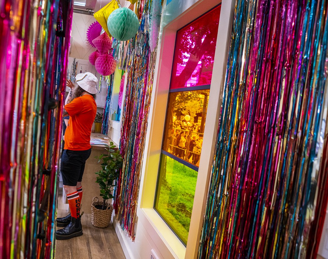 We leaned on the collaborative ideating tool Mural to moodboard and rough out our event space and flow. The tiny house was going to take up a chunk of the square footage available, but we filled the rest of the event with timeless rattan lounge spaces — one of the only spaces in the waterfront festival for visitors to sit down, the 6x12’ interactive coloring mural and a small business partner live screen printing a custom designed tote bag that fundraised for queer youth housing. To keep the party energy going, we decorated the inside of the tiny house with miles of mylar fringe and honeycomb decor.